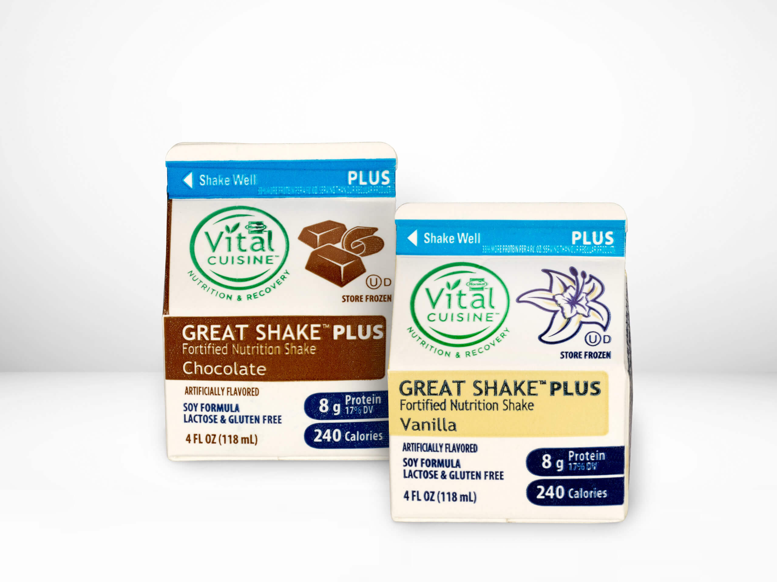 Great Shake™ Plus Soy protein shakes are an affordable method of adding dietary protein and calories. Great Shake™ Plus Soy shakes use a soy-based lactose-free formula, with tasty chocolate and vanilla varieties. Just conveniently thaw and serve.